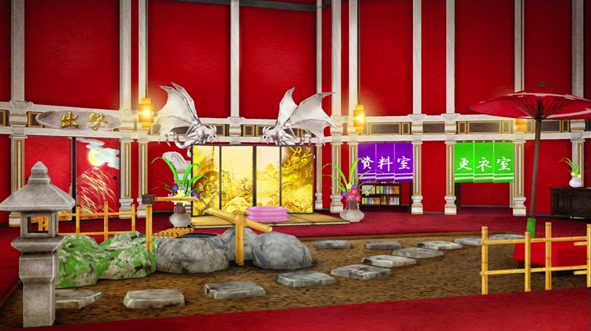 At the front top of the right side there is a gold partition placed on a wide tatami mat. Behind the partition are two gray gargoyle statues, and on the tatami mat there are three pink zabuton neatly stacked on each other. On the left side of the partition there is a sliding door that has a portrait of dusk. On the left there are two rooms separated by purple and green noren.