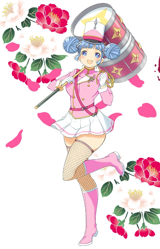 Kanon's outfit is inspired by a marching band. She wears a light pink and white top adorned with a fuchsia strap on her shoulders, gold buttons and accent lining, and a white lapel to match her pleat miniskirt. She also has light pink boots on with mesh stockings, along with a white and pink shako hat with a black flap. Pinned to her chest is a music note on a shuriken.