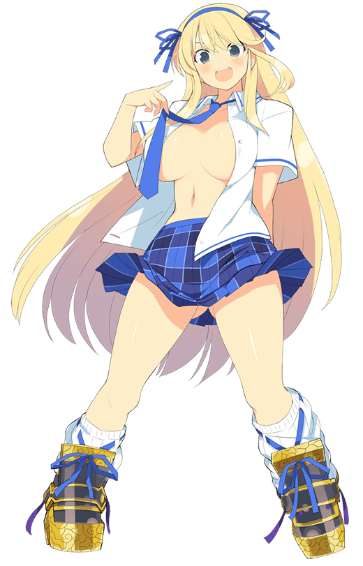 Katsuragi has blonde hair and a blue headband. Her bust size is 95 and her breasts are bigger than Asuka and Ikaruga's. She doesn't wear a bra and when she does Shinobi-Tenshin, all the buttons on her uniform are opened, revealing her stomach and breasts.