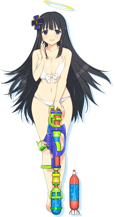 Ryōki is a tall girl with a generous complexion, clear white skin, black hime cut hair and dark blue eyes. Two hair bangs frame her face to descend to her bust while her back hair goes down to her knees in a bell shape. A halo floats above her head and she wears a cross-pattern ribbon with a golden button as a pin on the right side of her hair.